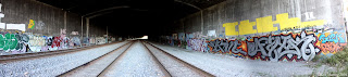 Although I may talk a good game about how great this spot is, don't take my posts or interest in the graffiti scene in general as some kind of promotion to go and get yourself in trouble here. It's not a safe place to be in relation to other spots. It's guarded by security and has been fenced off by the MTQ for good reason. It's a train tunnel in an otherwise dilapidated and crumbling highway exchange system. I've already had my close encounters in this tunnel and in the yards in general. Besides the tragic events that took place last Halloween this place can be a danger to anyone walking its environs. If you're a regular at this place then all the best to you, you're coming here on your own volition and know the risks. If your not then enjoy the pictures and my write up. If you decide to come to this spot then you do so at your own risk. If you are going though, be double safe, check twice in any direction, and make sure you have some one with you to watch your back as you would theirs.